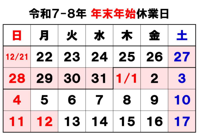 ≪株式会社ハナツカコンストラクション木くず産業廃棄物中間処理施設 R7-8年 年末年始休業日≫